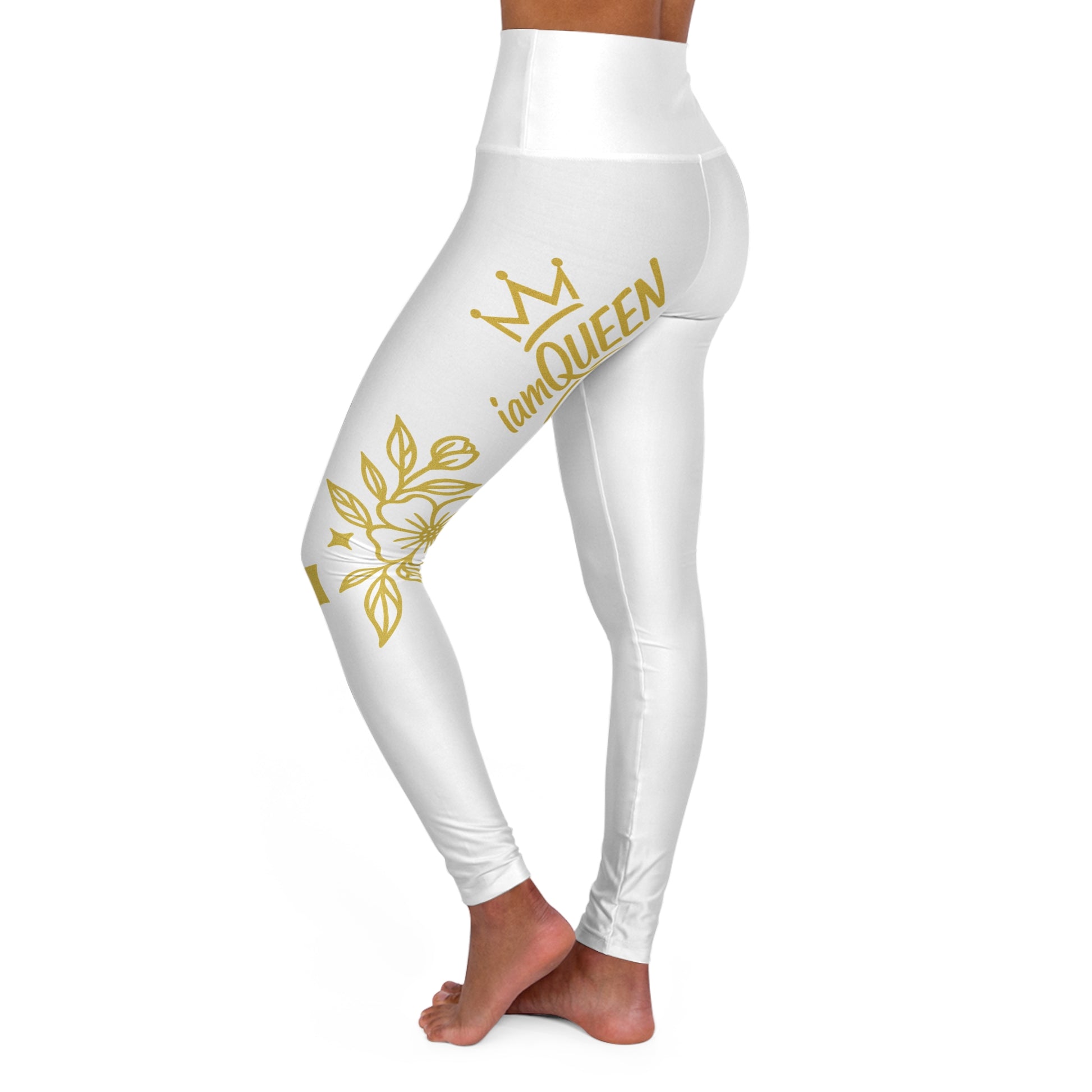 High-Waisted Yoga Leggings — Gold Floral “Namaste Queen” Side Print
