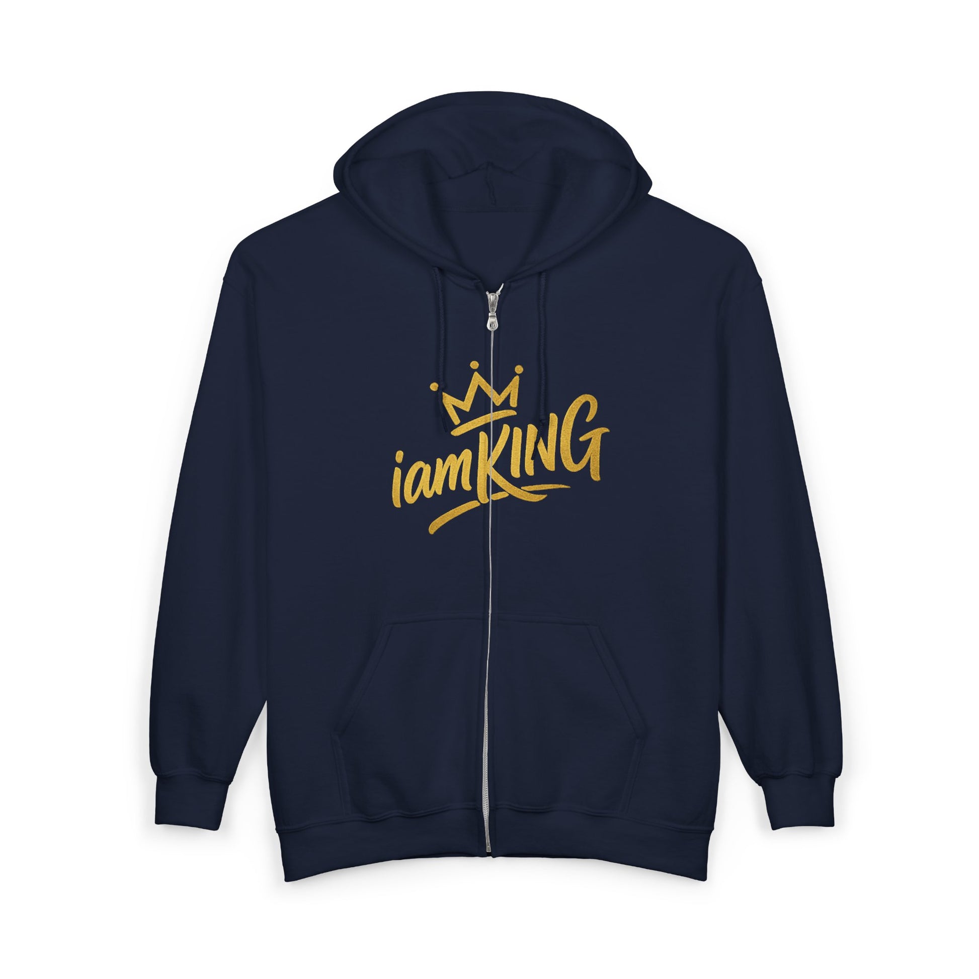 A warm, confident zip-up hoodie that feels like your personal emblem. Soft, midweight fabric shields against chill while the bold gold “iamKING” lettering and crown motif sit proudly on the chest — subtle from afar, commanding up close. The roomy front pockets hold a phone, keys, and small notepad. A sturdy metal zipper and adjustable hood give it practical edge; optional chest embroidery keeps the design crisp and long-lasting. Wear it on slow mornings, late-night creative sessions, or when you need a quiet reminder to stand tall.